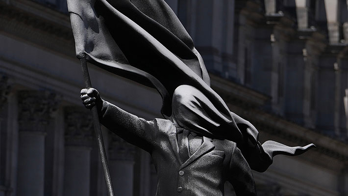 empuña una bandera que le tapa el rostro mientras parece marchar a paso firme,
