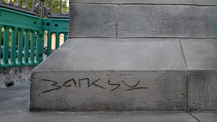 En el pedestal está grabada lo que parece ser la firma de Banksy.