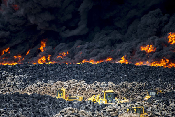 El vertedero apareció en los años 1990 y no ha dejado de crecer desde entonces. En 2003 fue declarado ilegal pero no se encontró ninguna solución para desprenderse de los neumáticos amontonados en casi 10 hectáreas, la superficie de 14 campos de fútbol.