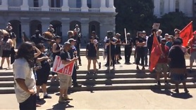 Según el periódico The Sacramento Bee, los enfrentamientos se produjeron entre 25 neonazis que tenían permiso para protestar en el Capitolio (escalones oeste) y más de 150 manifestantes anarquistas y antifascistas.
