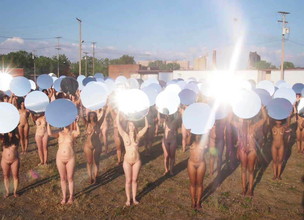 La puesta en escena de Tunick en Cleveland, titulada "Everything She Says Means Everything" (Todo lo que ella dice significa todo), mostró mujeres de todos los colores y formas, portando espejos hacia el centro de convenciones.