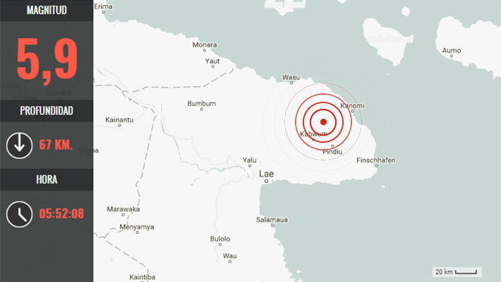 Con un epicentro a 67 kilómetros de profundidad, el temblor se registró a 58 kilómetros de distancia de la localidad costera de Finschhafen, según informó el Servicio Geológico de Estados Unidos (USGS), que mide la magnitud de los movimientos telúricos en el globo.