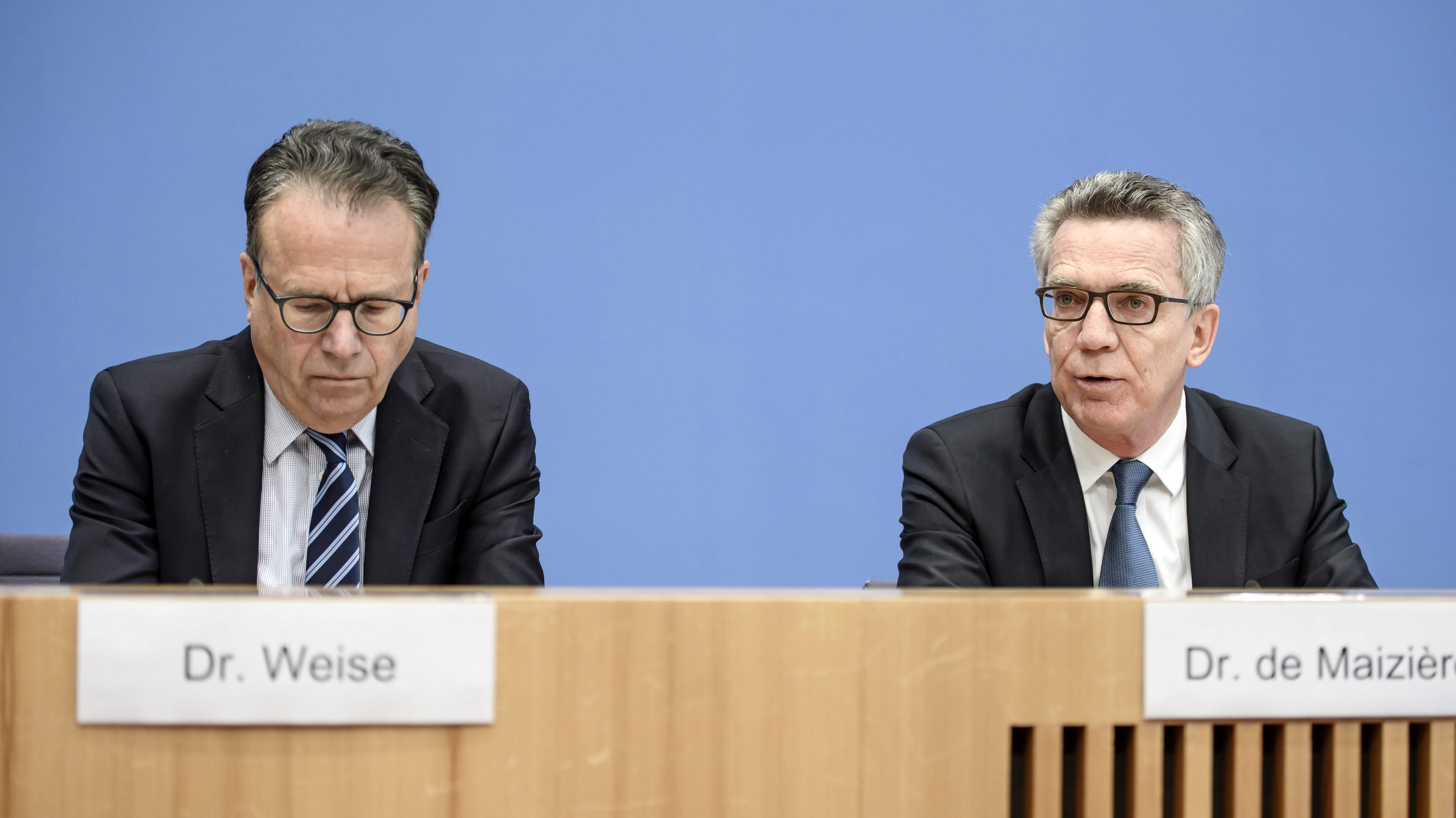 El ministro alemán, Thomas de Maizière, junto al jefe de Oficina Federal para la Migración y los Refugiados, Frank-Juergen Weise, en la conferencia de prensa sobre los refugiados en el 2016.