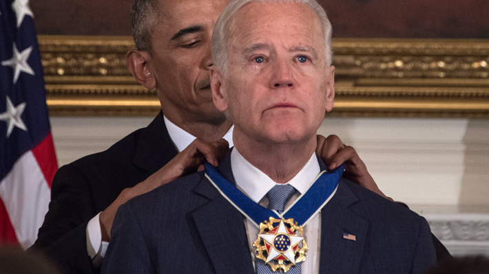Biden dejó escapar algunas lágrimas cuando el Presidente anunció que le entregaba la medalla presidencial de la Libertad, la recompensa civil más alta en Estados Unidos, por su "fe en los estadounidenses", su "amor al país", y su implicación en la vida política.