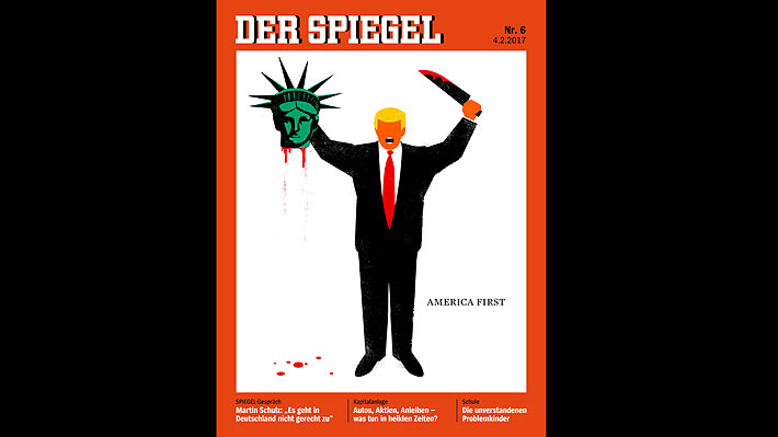 La portada del Spiegel se suma a otras que tematizan las polémicas decisiones del nuevo jefe de Estado norteamericano. El New Yorker mostró a la estatua de la libertad con la llama extinguida, mientras que el británico The Economist disfrazó a Trump de manifestante con un cóctel molotov con la inscripción de "Un insurgente en la Casa Blanca".
