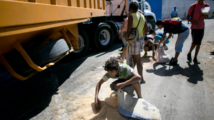 Un niño venezolano recoge del suelo arroz que cayó de un cargamento de alimentos.
