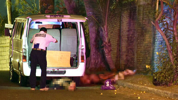 Imágenes muestran los cuerpos ensangrentados, algunos desnudos y atados de pies y manos, al interior y debajo de una camioneta blanca. En el parabrisas y maletero del vehículo había cartulinas con mensajes escritos aparentemente por criminales.