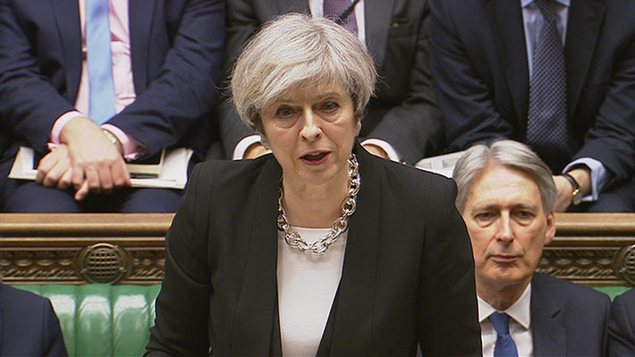 Theresa May durante su discurso de esta mañana en el Parlamento británico.