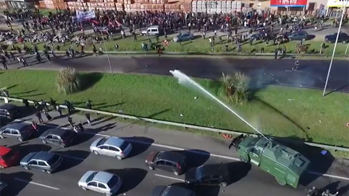 Testimonios de manifestantes y periodistas en el lugar denunciaron golpes a "palazos" por parte de los gendarmes que iniciaron el desalojo de la ruta. Imágenes captadas por medios locales, en tanto, mostraron cómo personal policial repelía con carros lanzaaguas a los manifestantes.