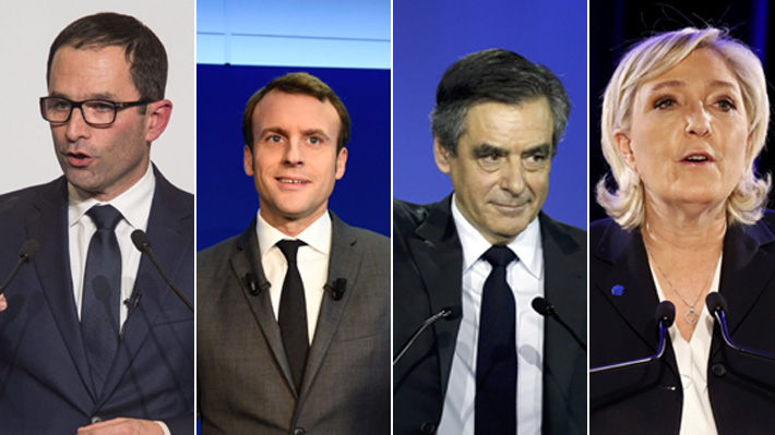El centrista Emmanuel Macron y la líder de extrema derecha Marine Le Pen encabezaban la intención de voto en los últimos sondeos publicados el viernes, pero el conservador François Fillon y el izquierdista Jean-Luc Mélenchon les pisaban los talones.