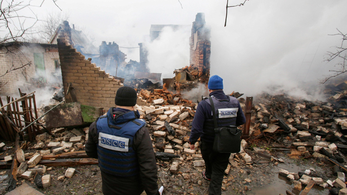 Los observadores de la Organización para la Seguridad y la Cooperación en Europa (OSCE) inspeccionan un edificio que fue bombardeado en Ucrania. Imagen del 25 de febrero de 2017.