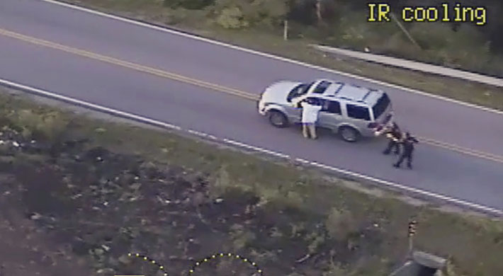 En imágenes de video del incidente, Crutcher se ve con las manos en alto, apoyándose contra su auto. Luego recibe un balazo en el pecho de Shelby y cae al suelo.