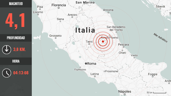 El temblor se registró a las 04:13 horas locales (22:13 horas en Chile) con un epicentro situado a 3 kilómetros de la localidad de Campotosto, en la provincia de l'Aquila, a ocho kilómetros de Amatrice, y a una profundidad de 3,8 kilómetros, según los registros del Instituto Nacional de Vulcanología.