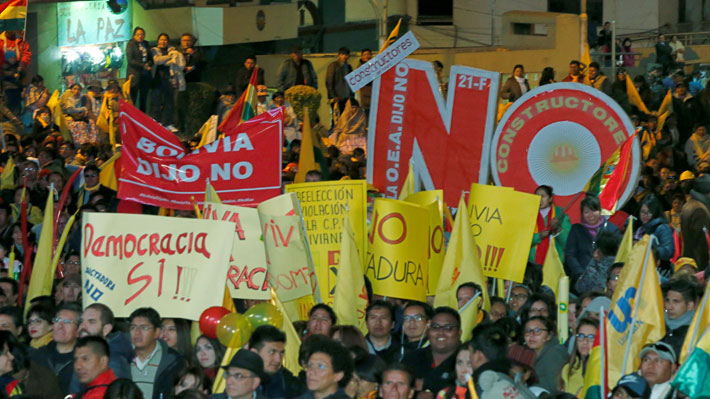La movilización en la plaza San Francisco en La Paz fue multitudinaria con grupos opositores y agrupaciones ciudadanas que portaban letreros con la palabra "No", que a mismo tiempo gritaban "Bolivia dijo 'No'" y "qué se vaya, que se vaya" sobre Morales.