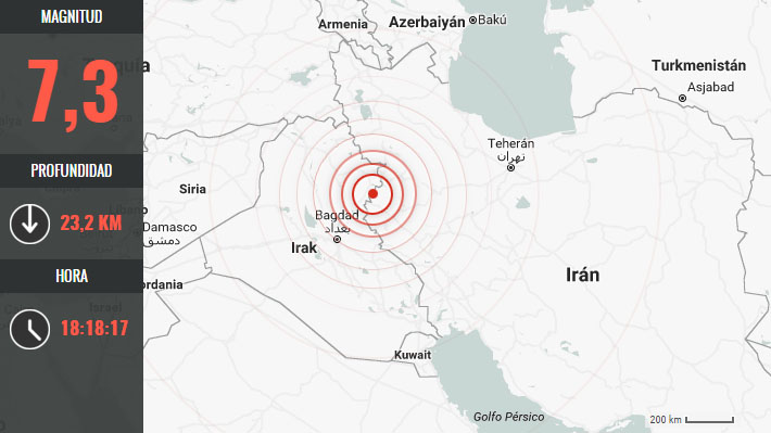 El terremoto 7,3 Richter ocurrió a las 18:18 GMT, con epicentro 32 km al suroeste de la ciudad iraquí Halabja y a una profundidad de 33,9 km, indicó desde Estados Unidos el Instituto Geológico de ese país (USGS).