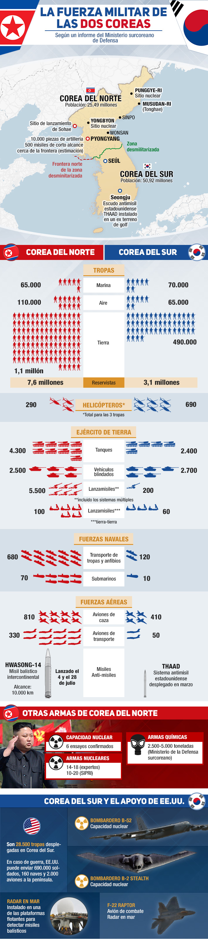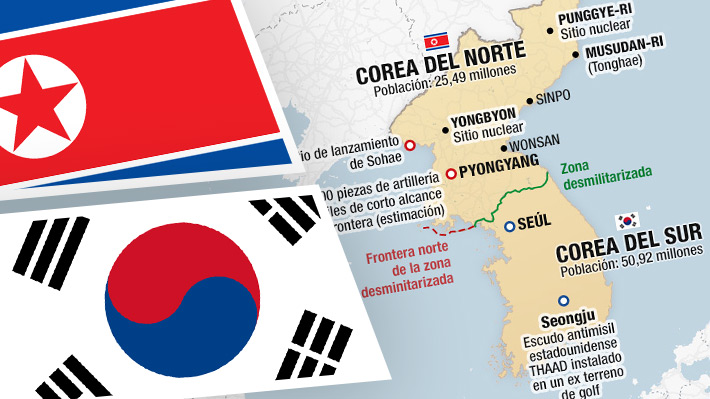 Infografía: Emol Diseño | Contenido: José Manuel Vilches | AFP | Fuente: Ministerio de Defensa de Corea del Sur | Natural Earth | Stockholm International Peace Research Institute | ONU | NTI | IISS | CSIS