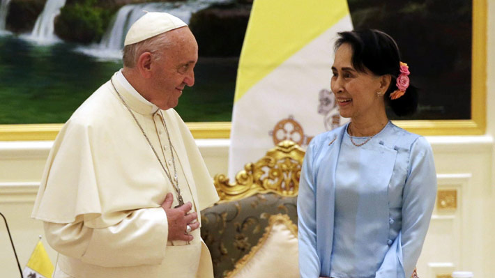 Francisco mantuvo una reunión privada durante este martes con el Presidente birmano, Htin Kyaw, y la Premio Nobel de la Paz y jefa de facto del Gobierno, Aung San Suu Kyi. Tras la cita, el Papa aseveró que "el futuro de Myanmar debe ser la paz, una paz basada en el respeto de la dignidad y de los derechos de cada miembro de la sociedad, en el respeto por cada grupo étnico y su identidad".