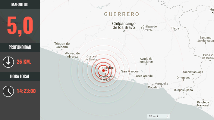 Según informó el Servicio Sismológico Nacional (SSN) de manera preliminar, el fenómeno se localizó a 7 kilómetros al este de Acapulco, en Guerrero, y tuvo lugar a las 14:23 hora local.
