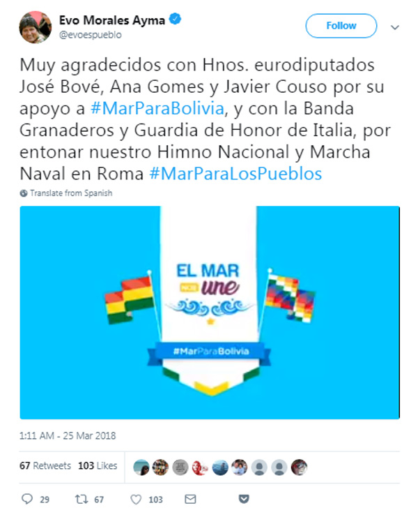 Con el uso del hashtag "#MarParaBolivia" y "#BoliviaNosUne" en láminas impresas, los diputados José Bové, de Francia; Ana Gomes, de Portugal; y Javier Couso, de España; aparecen junto al también jefe de misión ante la Unión Europea, Nestor Bellavite.