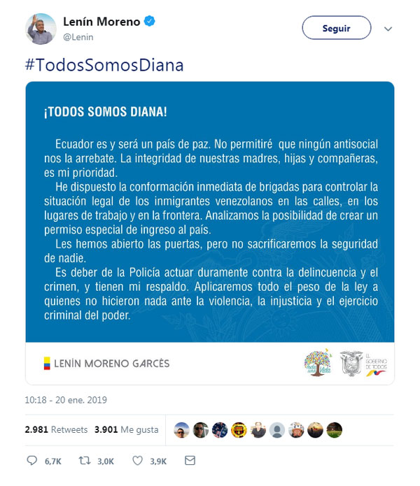Tampoco se hicieron esperar las reacciones por parte de las autoridades ecuatorianas, encabezadas por su Presidente, Lenín Moreno.