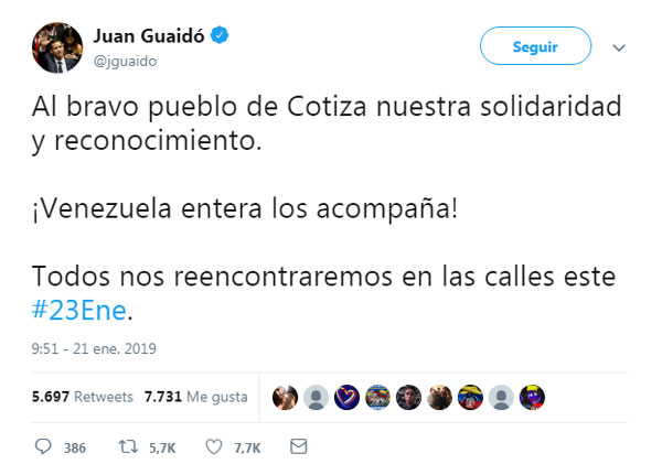 "¡Venezuela entera los acompaña!", enfatizó el parlamentario, llamando además a la ciudadanía a "reencontrarse en la calle" en la protesta convocada para este 23 de enero.