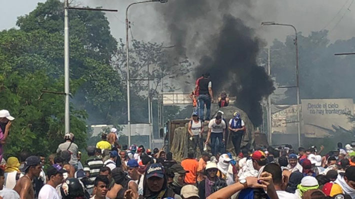 En una tensa jornada, algunos camiones con ayuda humanitaria lograron entrar en el país petrolero, pero al menos tres de ellos fueron quemados.