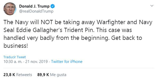 Tras esto, la polémica continuó el pasado jueves cuando el Mandatario twitteó: "La Armada NO va a quitarle el tridente de Navy Seal a Eddie Gallagher". Y agregó: "Este caso ha sido manejado muy mal desde el principio". Declaraciones que siguieron aumentando el conflicto entre la Armada y el Presidente.
