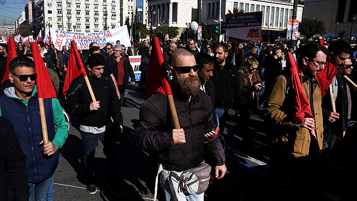 Miles de griegos salieron este martes a la calle con motivo de una huelga de 24 horas contra la reforma de pensiones del Gobierno conservador de Kyriakos Mitsotakis, que a primera hora provocó un colapso total del tránsito en Atenas.
