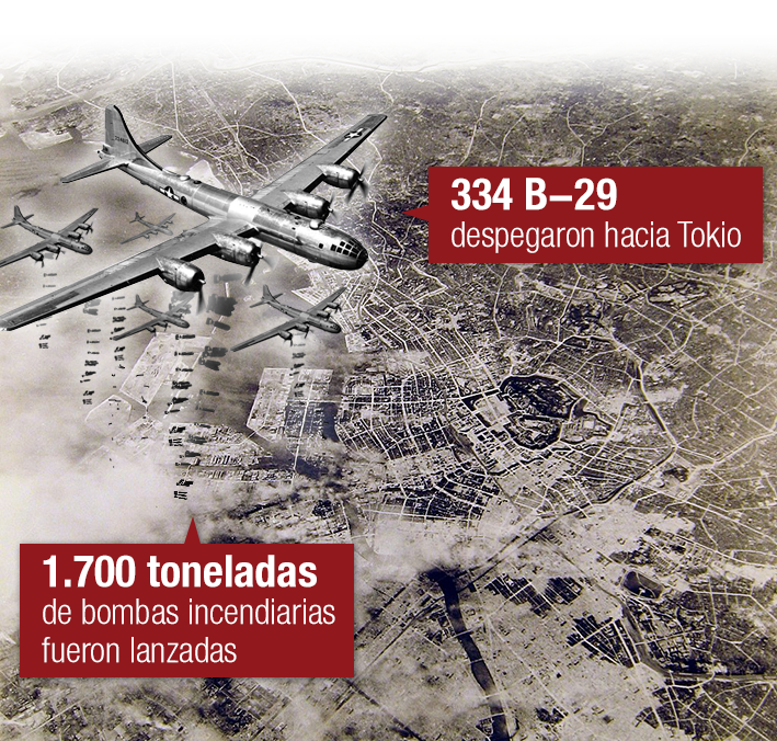 A las 22:00 horas del viernes 9 de marzo, Estados Unidos tomó la ofensiva y comenzó a bombardear a Tokio desde el cielo. En detalle, 334 aviones Boeing-29 despegaron hacia la urbe donde se encuentra —por lo demás— la casa del Emperador, el gabinete y las principales oficinas del gobierno. Las toneladas de bombas no sólo afectaron las estructuras al interior de la ciudad, sino que desconectaron la ciudad destruyendo los puentes y rutas que llegaban hacia ella.