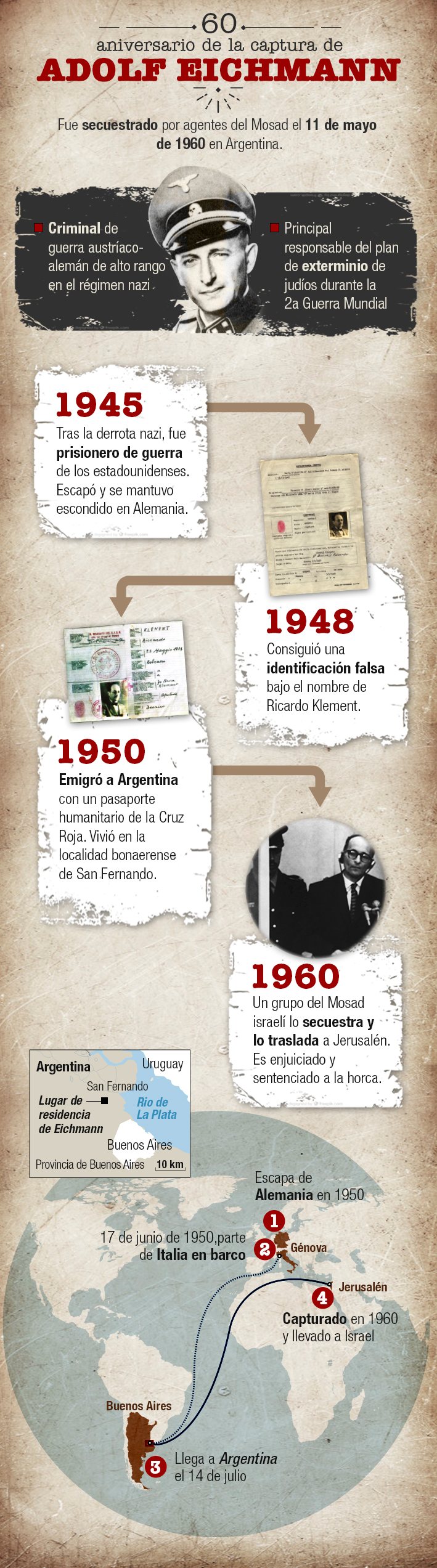 Tras años de investigaciones, pasaportes falsos y secretismo, un operativo israelí culminó en la localidad bonaerense de San Fernando la captura de Eichmann el 11 de mayo de 1960. Lo atraparon a su vuelta del trabajo en un Mercedes Benz, lo metieron en un vehículo y lo escondieron en una casa franca hasta que consiguieron trasladarlo clandestinamente a Israel, sedado y disfrazado de piloto en un vuelo que hizo escala en Dakar.