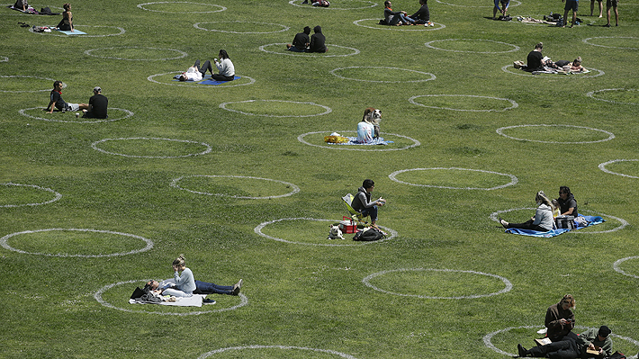 Personas se instalan al interior de los círculos dispuestos en el Dolores Park de San Francisco, para asegurar distanciamiento social.