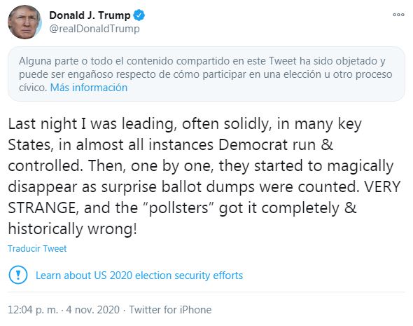 "Anoche venía liderando, en muchos casos de forma sólida, en muchos estados clave, casi todo gobernados y controlados por los demócratas", tuiteó. "Luego, uno por uno, empezaron a desaparecer mágicamente mientras se contaban papeletas sorpresa. Muy extraño, ¡y los "pollsters" (expertos políticos) lo entendieron completamente e históricamente mal!".