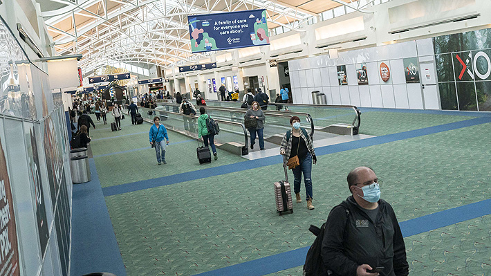 Viajeros caminan por el aeropuerto internacional de Portland. Varias autoridades llamaron a la gente a evitar los traslados para celebrar Acción de Gracias.