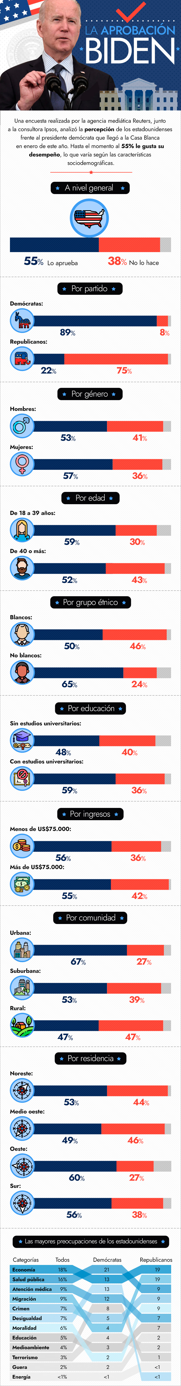 La encuesta hecha por la agencia Reuters, junto a la consultora Ipsos, analizó cuál es la percepción que se tiene sobre la administración del demócrata. Asimismo, ahondó en las principales preocupaciones de los estadounidenses, lideradas por la economía y la salud pública.