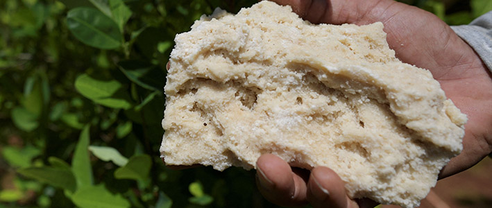 En la misma finca donde se cultiva, la hoja se pica y se procesa con cal, cemento, gasolina y sulfato de amonio hasta obtener la pasta base. Todas las semanas los "intermediarios" recogen la pasta dura y blanquecina (en la foto) para llevarla hasta los laboratorios clandestinos o "cristalizaderos" vecinos, donde los "químicos" la transforman en cocaína de alta pureza.