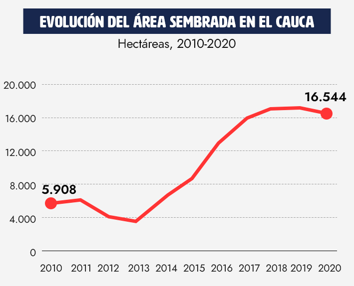 En 2017 el cultivo de coca se disparó hasta alcanzar el récord de 171.000 hectáreas. Aunque oficialmente unas 100.000 familias aceptaron destruir sus matas, la erradicación voluntaria no caló en Cauca por desconfianza hacia la palabra del gobierno, y la producción siguió con la mano de obra de colonos y migrantes.