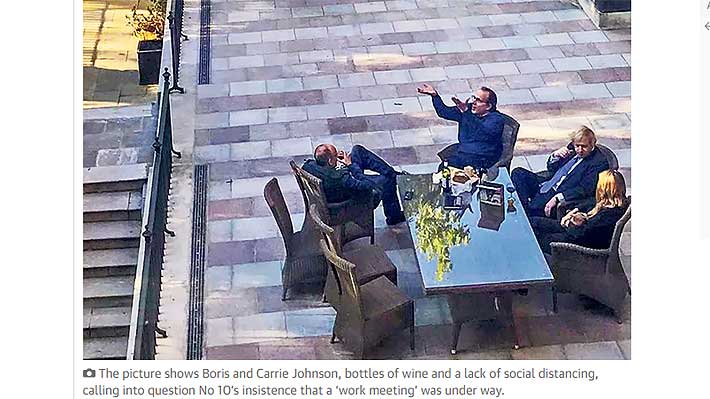 otra mesa con otros cuatro miembros del personal de la residencia oficial de Downing Street y, a la distancia, más personas conversando con copas en la mano, en momentos en que se exigía a los ciudadanos mantener la distancia social de dos metros y solo dos personas podían verse en exteriores.