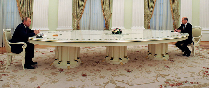 Putin, Scholz y la larga mesa que los separó (Foto: AP).