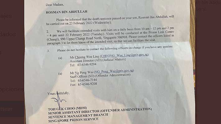 "Se le informa de que la condena a muerte sobre su hijo, Rosman bin Abdullah, será ejecutada el próximo 23 de febrero", señala una carta del servicio de prisiones isleño enviada hoy a la madre de Rosman bin Abdullah, publicada en Twitter por Kirsten Han, activista contra la pena de muerte en Singapur.