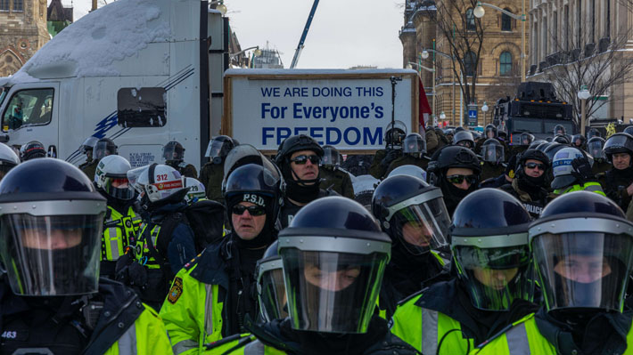 En una escalada de la operación iniciada el viernes para desbloquear el centro de la capital canadiense, decenas de agentes equipados con material antidisturbios consiguieron despejar buena parte del núcleo de la protesta, donde quedaban muchos menos manifestantes que el día anterior.