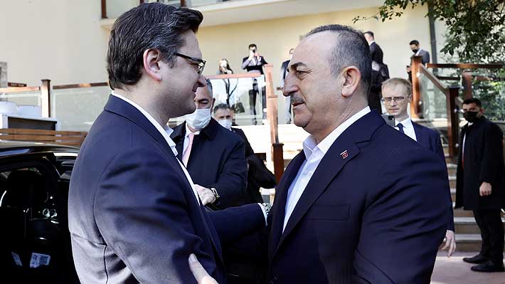 El canciller turco, Mevlut Cavusoglu (derecha), saluda a su par ucraniano, Dmytro Kuleba (izquierda).