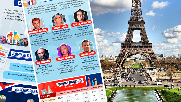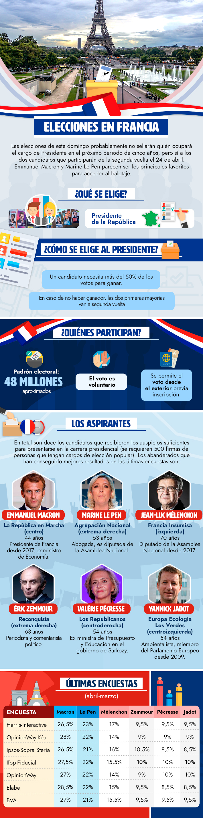 El actual Mandatario, Emmanuel Macron, encabeza las encuestas para avanzar a la segunda vuelta con la abanderada de Agrupación Nacional, Marine Le Pen, ya que ningún candidato lograría la mayoría absoluta.