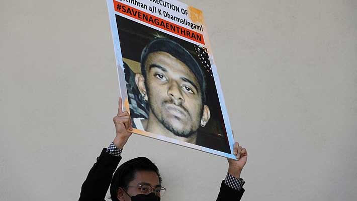 Un activista sostiene un cartel en contra de la ejecución de Nagaenthran -Nagen- Dharmalingam.