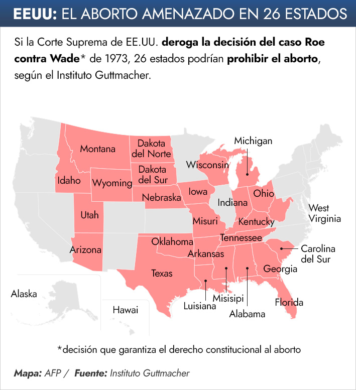 El Instituto Guttmacher calcula que 26 de los 50 estados de EE.UU. prohibirán con toda seguridad o probabilidad el aborto si se anula el caso Roe versus Wade (ver infografía), lo que dejaría a las mujeres de grandes franjas del suroeste y el medio oeste de Estados Unidos sin acceso cercano a este procedimiento médico.