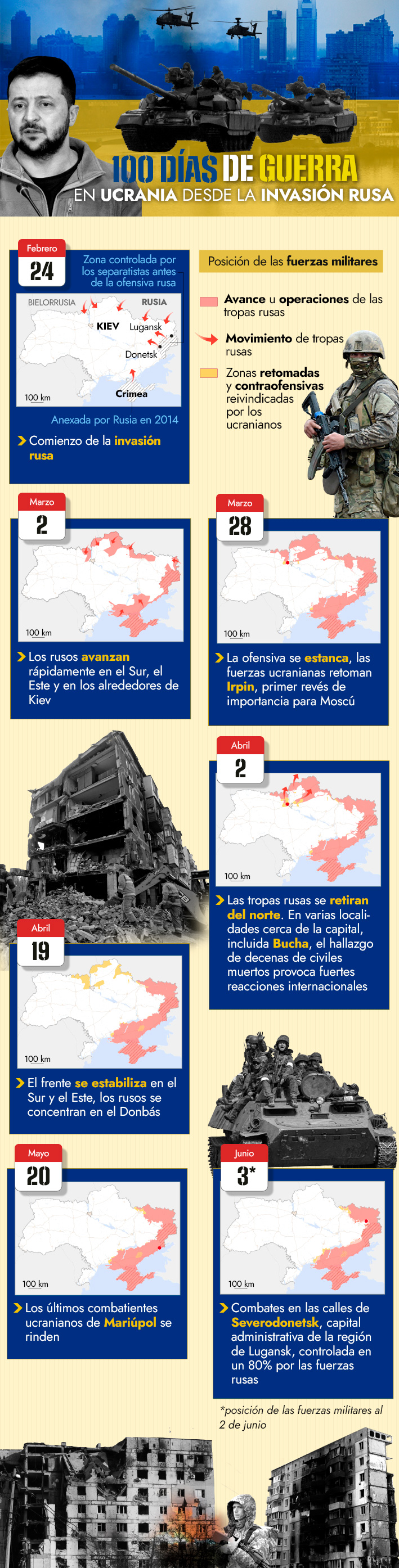 La evolución de los cien días de la guerra en Ucrania en siete mapas: Cuál ha sido el avance de las fuerzas rusas