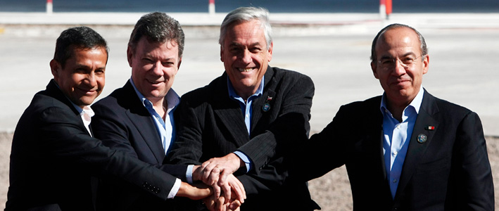 Humala, Santos, Piñera y Calderón al firmar el acuerdo marco en 2012 | EFEPara analistas, la Alianza del Pacífico se ha convertido en un bloque comercial benéfico para empresarios de México, que han fortalecido su inversión en Chile, Colombia y Perú.