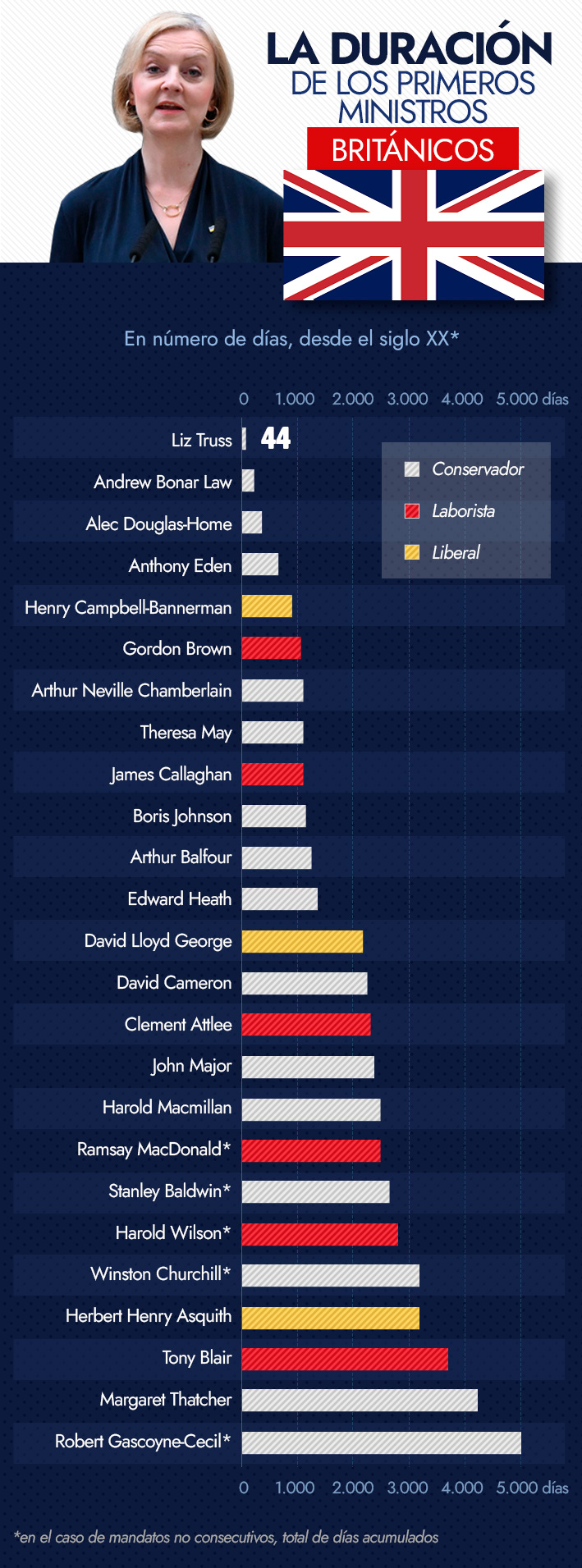 Los 44 días de Liz Truss marcan un récord: Cuánto han durado los primeros ministros británicos