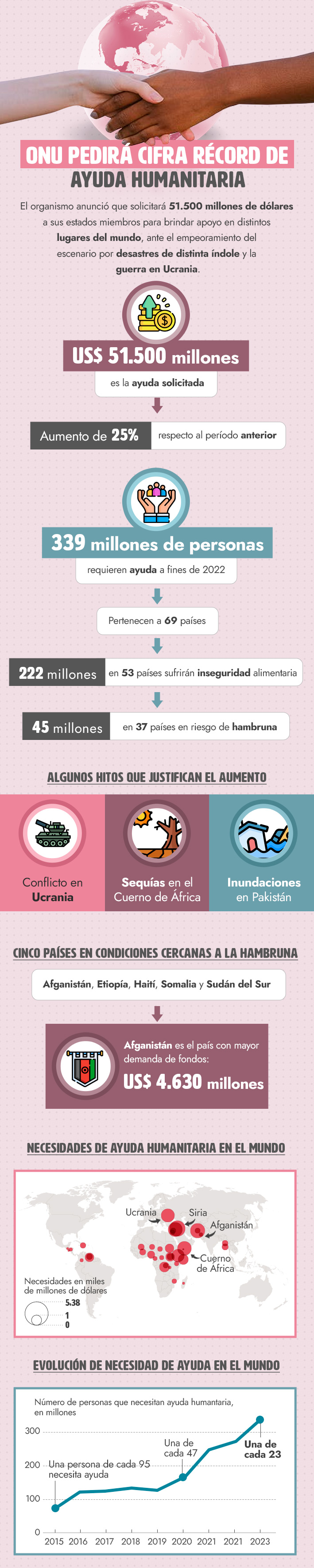 El organismo necesitará de más de 51.000 millones de dólares para poder abarcar la cantidad de asistencia requerida ante desastres de distinto tipo y conflictos como el de Ucrania.