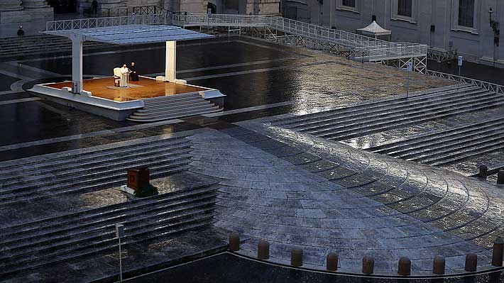 El Papa reza en la plaza de San Pedro en plena pandemia. Crédito: EFE.Rezo en una plaza de San Pedro vacía en plena pandemia