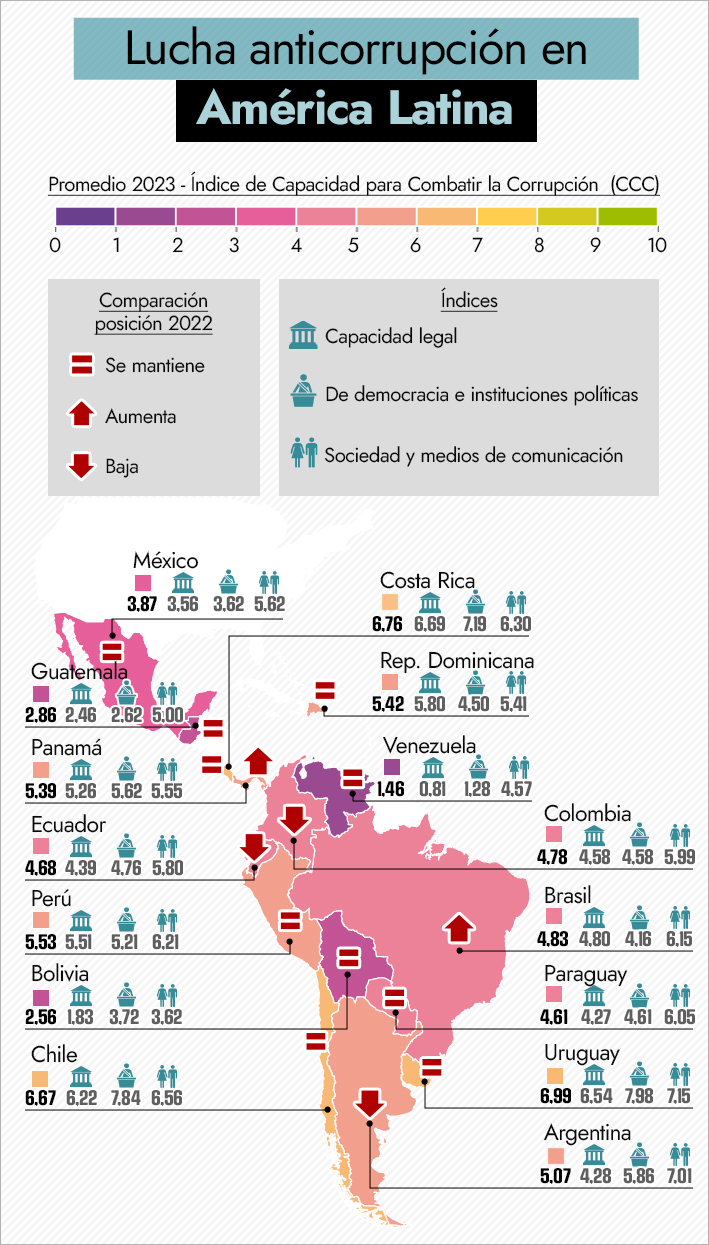 *Información técnica: el CCC se calcula teniendo en consideración 14 variables categorizadas en capacidad jurídica (independencia y eficiencia judicial; independencia y eficiencia de las agencias anticorrupción; acceso a la información pública y transparencia general del gobierno; independencia y recursos para la fiscalía nacional y los investigadores; nivel de experiencia y recursos disponibles para combatir la delincuencia de cuello blanco; calidad de la indulgencia e instrumentos de negociación y cooperación internacional); democracia e instituciones políticas (calidad y exigibilidad de la legislación de financiamiento de campañas; procesos legislativos y de gobierno y calidad general de la democracia) y sociedad civil, prensa y sector privado (movilización de la sociedad civil contra la corrupción; mejoras educativas; calidad de la prensa y periodismo de investigación y comunicaciones digitales y redes sociales) | Infografía: Jorge Marambio, El Mercurio | Adaptación web: Johanna Mellado, Emol | Fuentes: Informe de Índice de Capacidad para Combatir la Corrupción 2022
